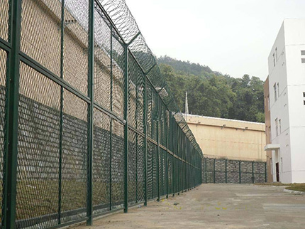 監獄防護網主要是采用高強度的刀片刺網與普通防護網的結合,V型支架立拄,加強型焊接片網,安全防盜連接件和刀片刺網組成.刀片刺網是一種新型防護網,由銳利尖角鍍鋅鋼板或不銹鋼薄板做刀片,鋼絲做芯線組合而成的防護器材。
