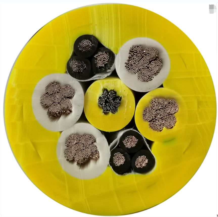 護套:PUR聚氨酯彈性體復合料(雙護套); 加強件:芯線中添加高強度柔性抗拉元件;抗扭層:雙護套中間有抗扭層(抗拉芳綸編織); 結構:擠壓式結構成纜